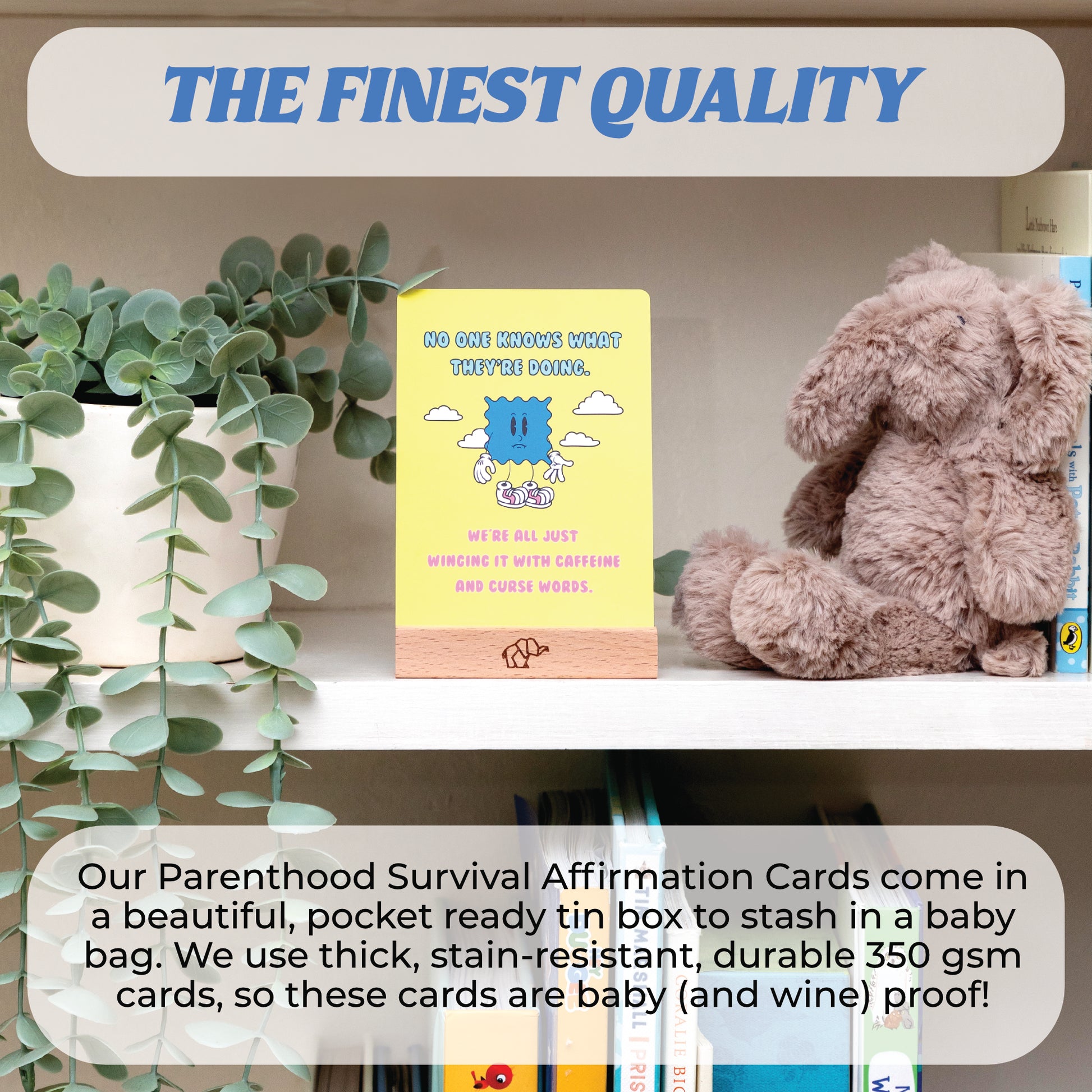 Congratulations! You’ve entered the warzone called parenting. Here’s a lifeline: 50 cards of dark humor and sarcasm to help you laugh (or cry) your way through the chaos. These aren't your average affirmations - they’re unapologetically honest gems like, “At least you kept them alive today” paired with ironically playful illustrations that capture the delightful struggle of modern parenthood. Printed on high-quality 350 gsm card stock, these affirmations of "you're-not-alone" resilience come in a sleek tin box, complete with a pinewood stand to proudly showcase your new mantra: “Wine is a fruit, and fruit is healthy.”